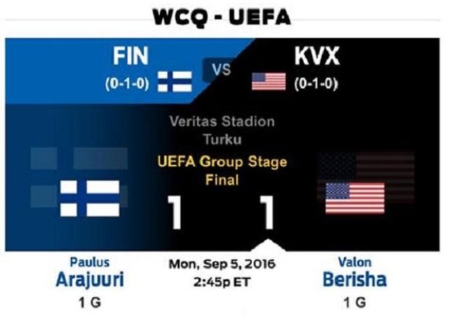 Medijska kuća iz Sjedinjenih Američkih Država, dala je publicitet utakmici između Finske i Kosova u kvalifikacijama za SP, ali i napravila neobičnu grešku. Naime, kod grafike sa rezultatom i strelcima meča, uz ime selekcija Kosova stajala je zastava SAD.