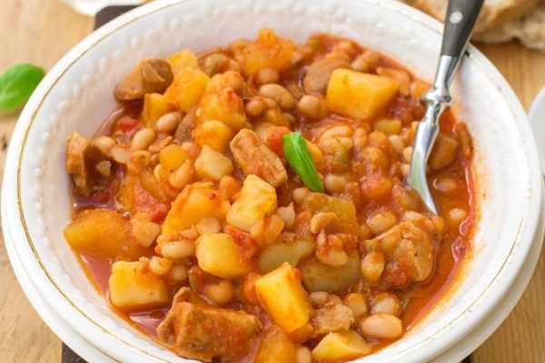 Sastojci: 1 žlica ulja 1 luk 2 režnja češnjaka 200 g dimljenog hamburgera 300 g krumpira 2 lista lovora 500 ml vode ½ žličice slatke crvene paprike 1 žličica peršina 50 ml pasirane rajčice sol 300 g kuhanog ili graha iz konzerve Priprema: Dinstajte sastojke.Na ulju dinstajte hamburger nasjeckan na komadiće i nasjeckani luk oko…