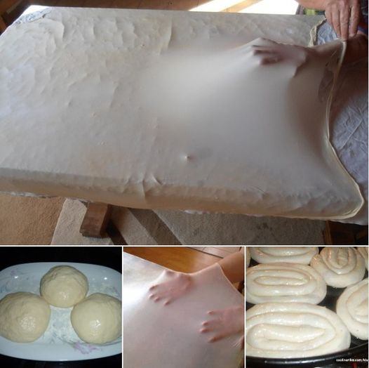 Od ove količine sastojaka dobijemo 1 i 1/2 kg tijesta, koje podjelimo na tri djela, da u svakom komadu tijesta bude 1/2 kg. Slozimo u pleh i premazemo uljem da odstoji. Kada ja pravim pitu obično zamijesim tijesto i stavim ga u frizider da odstoji . Jedan sat prije nego sto hocu da pravim pitu izvadim iz frizidera da se malo ugrije na sobnoj temperaturi i onda razvijanje moze da počne.