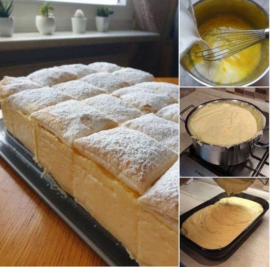 Izlupati cvrsti snjeg od 6 bjelanjaka i 10 zlica secera, te lagano umjesati u malo ohladjenu kremu i filovati u dubljoj tepsiji izmedju dva lista a gornji da bude vec narezan na kocke radi lakseg rezanja.