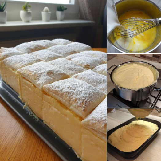 Izlupati cvrsti snjeg od 6 bjelanjaka i 10 zlica secera, te lagano umjesati u malo ohladjenu kremu i filovati u dubljoj tepsiji izmedju dva lista a gornji da bude vec narezan na kocke radi lakseg rezanja.