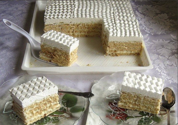 U pleh veličine 25×35 cm poredjati keks ( ne potapati ga ni u kakvu tečnost), preko staviti sloj fila, keks sloj fila, tako redom, na kraju staviti sloj fila.