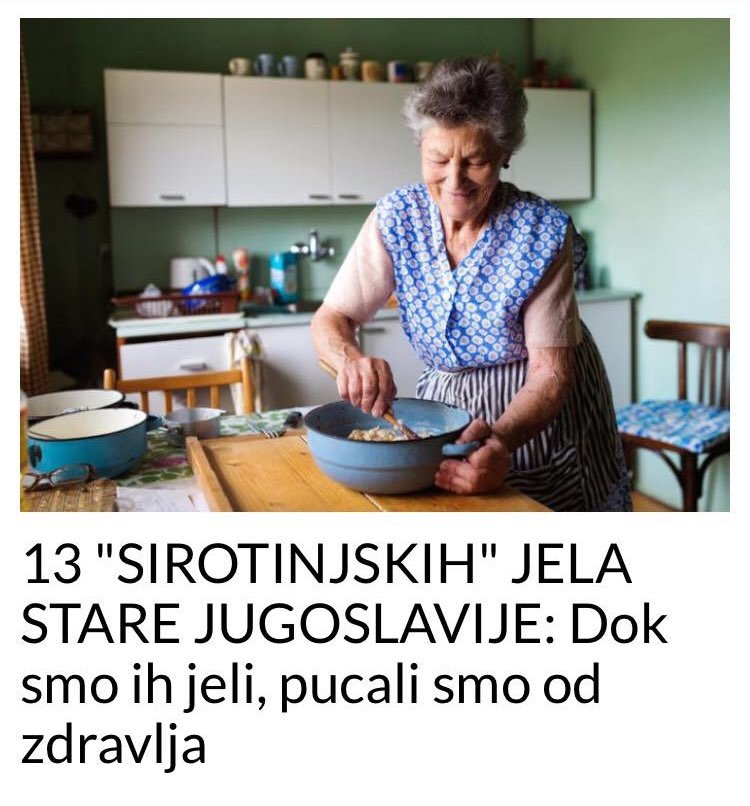 Svako od nas ima sjećanje na neko starinsko jelo koje se spremalo u Jugoslaviji. Zbog toga što nam za njihovu pripremu nije potrebno mnogo namirnica, nazvali smo ih “sirotinjska jela”.Bilo da je razlog bio udaljenost od najbliže prodavnice ili neimaština, “sirotinjska jela” su se spremala sa vrlo malo namirnica. Često su to i najukusnija jela kojih se rado sjećamo iz vremena stare Jugoslavije.