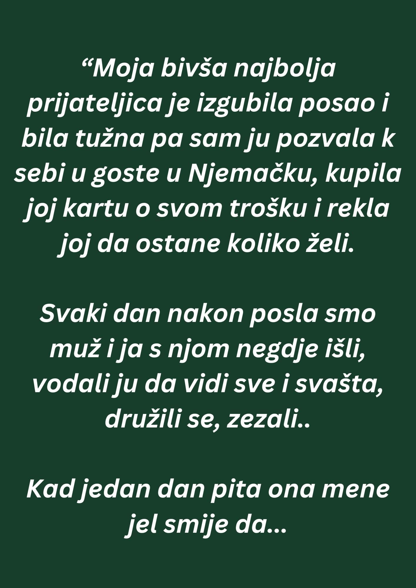 “Moja bivša najbolja prijateljica je izgubila posao i bila tužna pa sam ju pozvala k sebi u goste u Njemačku, kupila joj kartu o svom trošku i rekla joj da ostane koliko želi. Svaki dan nakon posla smo muž i ja s njom negdje išli, vodali ju da vidi sve i svašta, družili se, zezali…..
