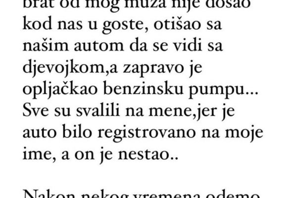 Svekrva mi je bila kao rođena majka, sve dok njen stariji sin, brat od mog muža nije došao kod nas u goste, otišao sa našim autom da se vidi sa djevojkom,a zapravo je opljačkao benzinsku pumpu… Sve su svalili na mene,jer je auto bilo registrovano na moje ime, a on je nestao …