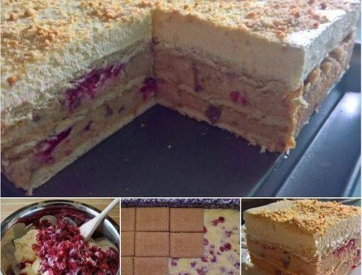 Priprema kolaca traje 15 minuta.I vec nakon 1-2 sata ga mozete posluziti. Mozete ga posluziti i kao tortu.Od ove kolicine sastojaka dobicete torticu od dvadesetak parcica. Sastojci: 400g kisele pavlake 20%mm 200g secera u prahu 1 vanilin secer 200g mlevene plazme 100g mlecne cokolade sa jagodom ili malinom 300g keksa petit sa maslacem 100g malina…