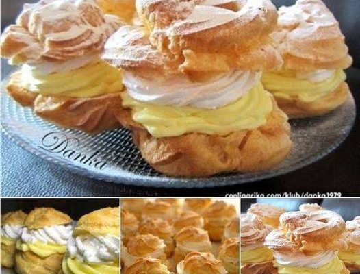 Sastojci za tijesto 2,5 dl vode 125 g margarina 150 g brašna 1 kašika šećera mrvica soli 4 kom jaja a kremu 1/2 l mlijeka 250 g šećera 2 kom žumanca 4 kašike uvrh pune gustina 2 kom vanil šećera 125 g margarina i još 3 dl slatke pavlake Priprema 1. U posudu sipati vodu,…