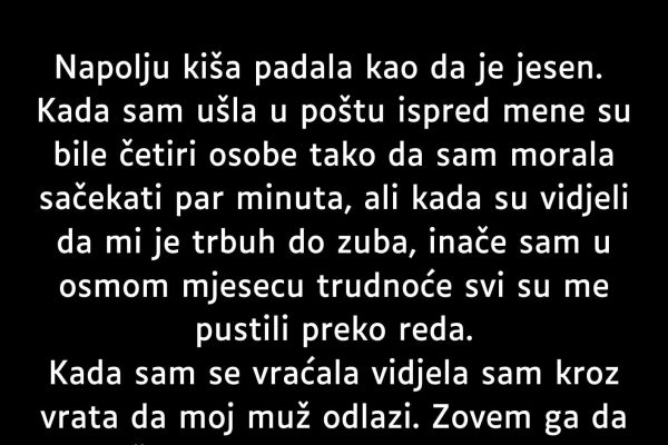 “Jučer me muž odvezao u grad da platim račune za struju i telefon te mi je rekao da požurim jer on mora da se vidi sa nekim prijateljima. Napolju kiša padala kao da je jesen. Kada sam ušla u poštu ispred mene su bile četiri osobe tako da sam morala sačekati par minuta, ali…