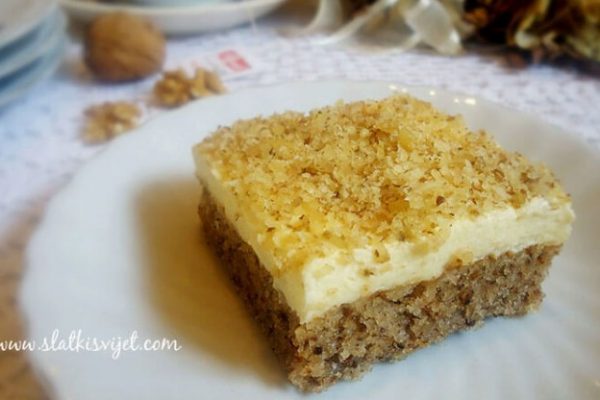Sastojci: Biskvit s orasima: 1 jaje 1 šalica šećera 1 šalica mljevenih oraha 1 šalica mlijeka ½ šalice ulja 1 šalica glatkog brašna 1 prašak za pecivo Puding krema od vanilije 600 ml mlijeka 6 žlica šećera 2 praška za puding s okusom vanilije 200 g margarina sobne temperature Priprema: Za pripremu biskvita koristite šalicu…