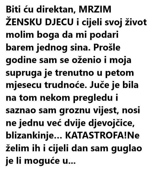 Prošle godine sam se oženio i moja supruga je trenutno u petom mjesecu trudnoće. Juče je bila na tom nekom pregledu i saznao sam groznu vijest, nosi ne jednu već dvije djevojčice, blizankinje… KATASTROFA!