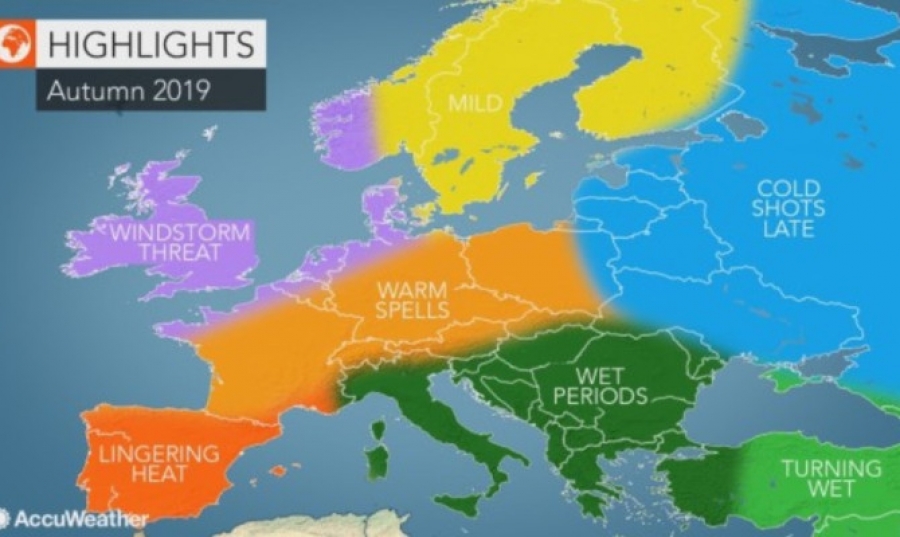 Prema meteorologu AccuWeathera Alanu Reppertu, kombinacija postropskih oluja i vjetra učinit će jesen vlažnijom nego što je uobičajeno. Usprkos tome, u ovom dijelu Europe bit će i razdoblja suhog isunčanog vremena s temperaturama i višima od prosječnih. Međutim, novi toplinski valovi se ne očekuju.
