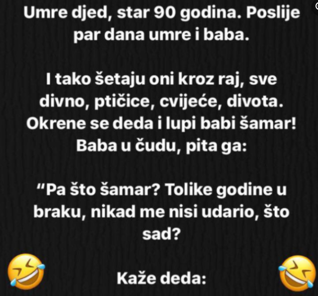 I tako šetaju oni kroz raj, sve divno, ptičice, cvijeće, divota. Okrene se deda i lupi babi šamar! Baba u čudu, pita ga: