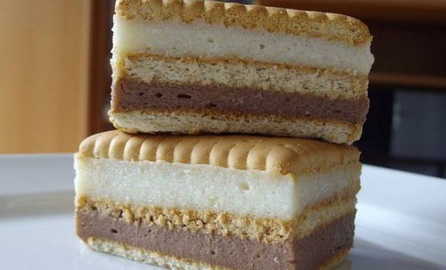 Zakuhajte mlijeko sa šećerom, dodajte margarin da se rastopi pa u tome zakuhajte griz. Podjelite smjesu na dva dijela pa u jedan dodajte kakao, a u drugi vanili šećer i limun. U kalup veličine 20×30 poslažite kekse pa prvo stavite crnu smjesu.
