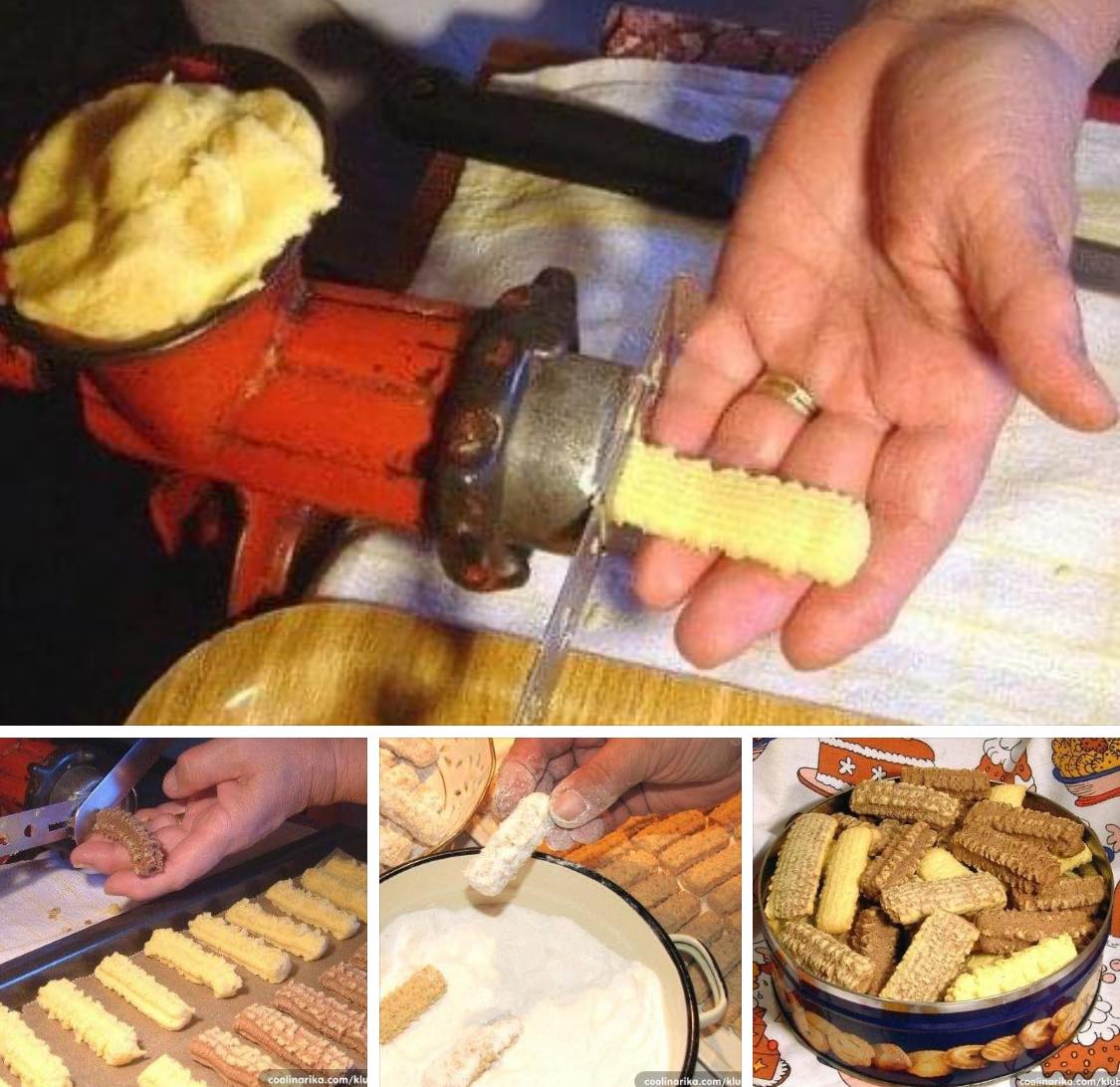 Prije šezdesetak, pa i više godina, to se radilo ovako. Na stoj za mljevenje mesa stavio se nastavak za profiliranje keksa.