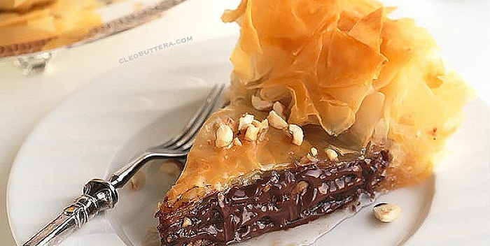 Na dno kalupa poslažite jednu na drugu 8 kora, a svaku premažite maslacem, na osmu koru stavite ½ šolje nutele i ¼ šolje lešnika, na lešnike stavite 4 kore, između premazane maslacem, pa slažite dok ne potrošite sav materijal. Baklavu završite sa još 8 kora naslaganih jednu na drugu između premazanih maslacem.