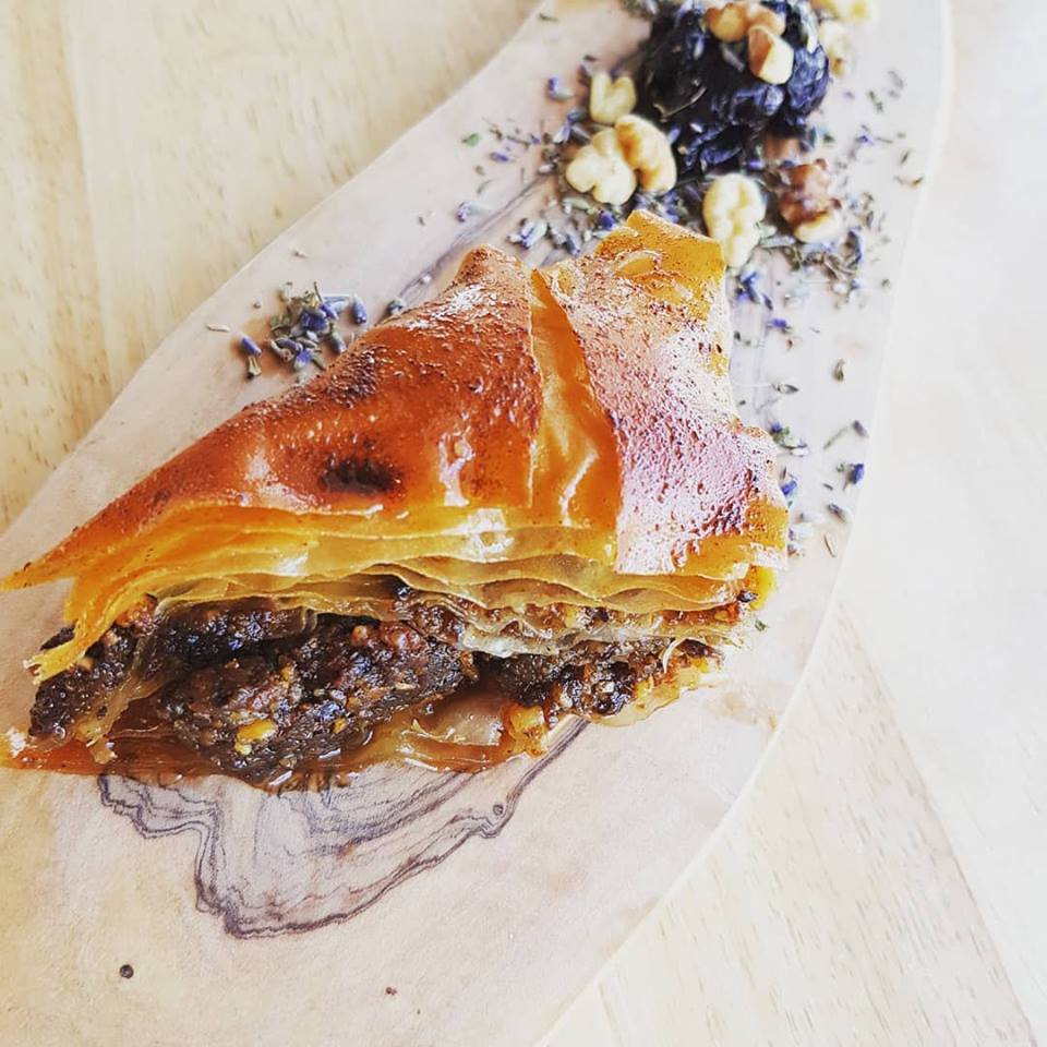 - U pleh koji ste prethodno pomastili redajte četiri kore (svaku pomastite), na to rasporedite polovinu fila. Sve prekrijte s dvije kore, dodajte ostatak fila i odozgo stavite još četiri kore.
