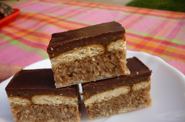 Masu dobro izmešati i naneti preko keksa. Ostaviti da se ohladi i staviti glazuru od čokolade. Istopiti čokoladu sa uljem na tihoj vatri i preliti kolač i preko čokolade dok se još nije stegla posuti kokos.