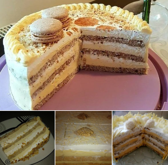 prvu koru staviti na tacnu, mazati sa trećinom prve kreme, pa sa trećinom druge kreme, posuti sa poprženim lješnjacima….postupak ponoviti još dva puta……meni je ostalo kreme pa sam cijelu tortu premazala s njom.
