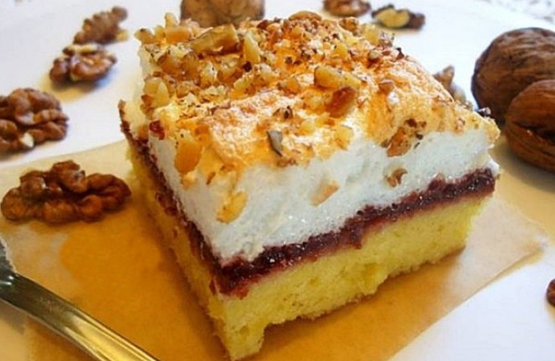 Koristite pekmez koji najviše volite u kolačima! Bjelanjke izmiksajte u snijeg. Dodajte im limunovu koricu i malo po malo šećera pa nastavite miksati dok ne dobijete gusti snijegSnijeg ravnomjerno rasporedite preko pekmeza i posipajte ga sjeckanim orasima. Kolač pecite, odnosno sušite dodatnih 10-tak minuta na temperaturi od 130-150 °C.