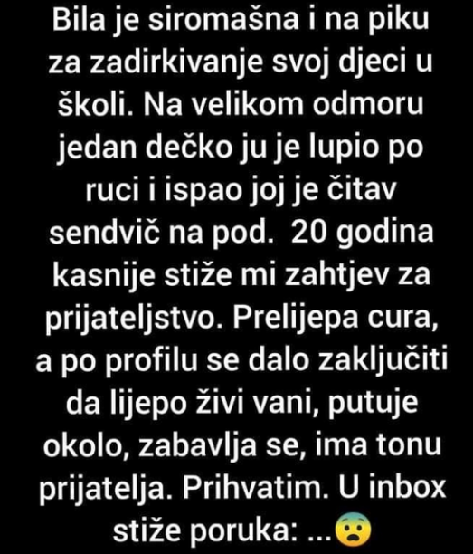 Bila je siromašna i na piku za zadirkivanje svoj djeci u školi. Na velikom odmoru jedan dečko ju je lupio po ruci i ispao joj je čitav sendvič na pod. Dvadeset godina kasnije stiže mi zahtjev za prijateljstvo.