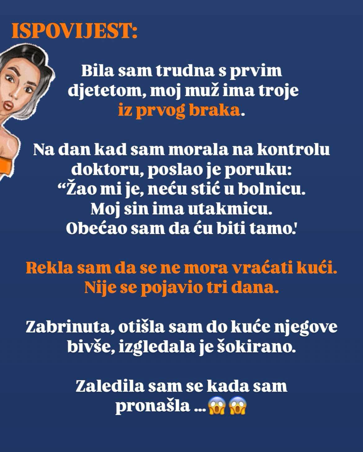Bila sam trudna s prvim djetetom, moj muž ima troje iz prvog braka. Na dan kad sam morala na kontrolu doktoru, poslao je poruku: