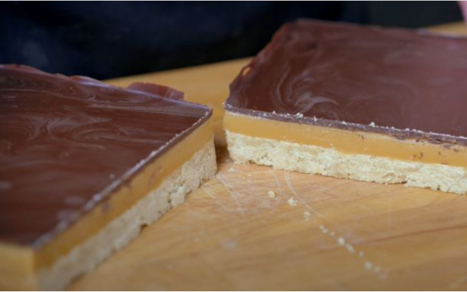 U posudi za mikrotalasnu pećnicu istopite karamele u mikrotalasnoj pećnici 60 sekundi, mešajući, a zatim ponavljajte u intervalima od 30 sekundi dok se ne istopi i ne postane glatka.Prelijte karamel preko sloja kolačića.Stavite pleh u frižider da se ohladi dok sloj testa za kolače ne bude spreman.
