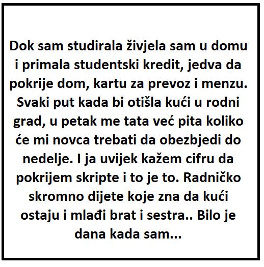 Dok sam studirala živjela sam u domu i primala studentski kredit, jedva da pokrije dom, kartu za prevoz i menzu. Svaki put kada bi otišla kući u rodni grad, u petak me tata već pita koliko će mi novca trebati da obezbjedi do nedelje. I ja uvijek kažem cifru da pokrijem skripte i to je to. Radničko skromno dijete koje zna da kući ostaju i mlađi brat i sestra.. Bilo je dana kada sam gladna otišla u krevet jer bi se tako kasno vratila sa faxa da menza više nije radila.