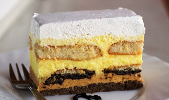 Poredati na tacnu red piškota namočenih u sok. Zatim ide smjesa koju dobijemo kada sjedinimo 1 kutiju mljevene plazme, 1 margarin od 250 g (koji je bio na sobnoj temperaturi), 100 g šećera u prahu, 2 sitno sjeckane čokoladice i malo vrućeg soka i sve to fino sjediniti. Skuhati pudinge u 1 l mlijeka sa 20 kašika šećera. Kad se ohladi, umutiti margarin i sjediniti sa filom, a zatim fil podijeliti napola.