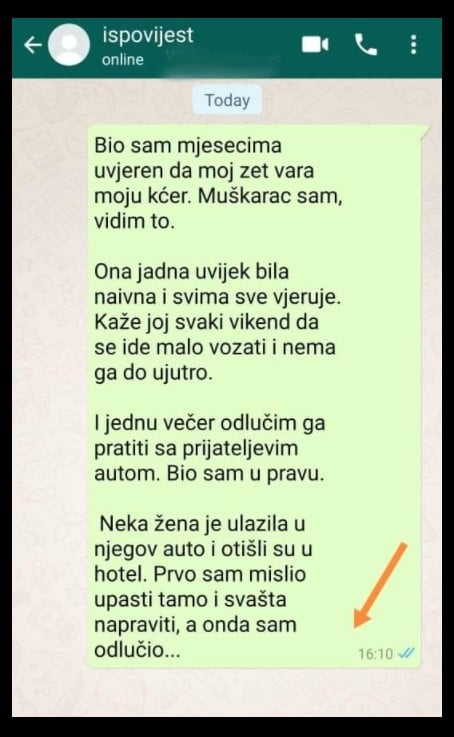 Bio sam mjesecima uvjeren da moj zet vara moju kćer. Muškarac sam, vidim to. Ona jadna uvijek bila naivna i svima sve vjeruje. Kaže joj svaki vikend da se ide malo vozati i nema ga do ujutro. I jednu večer odlučim ga pratiti sa prijateljevim autom. Bio sam u pravu.