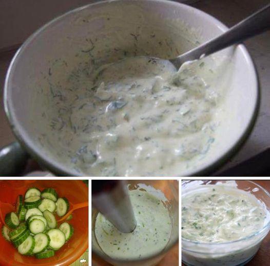 U plastičnoj posudi pomiješati jogurt,vrhnje,senf ,med, vlasac,origano i kopar.Promiješati pa još začiniti po želji.Dobro promiješati i dodati zgnječene krastavce.