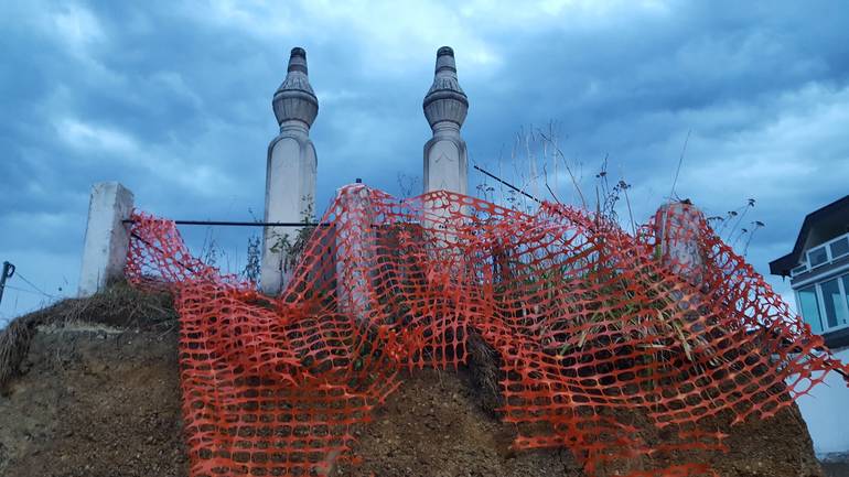 Uz samu saobraćajnicu između stambenih i poslovnih objekata – na gradilištu ostavljeno brdašce – uzvisina tri do četiri metra visoka i tolikog prečnika sa mezarima, poput čardaka „ni na nebu ni na zemlji“. Omotana u trake i mrežu, valjda zbog daljeg obrušavanja.