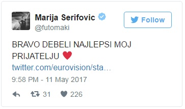 Nakon toga, napisala je da ‘odlazak na Euroviziju nije izlet, a kada se to promjeni od Srbije će onda nešto i biti’ te čestitala srpskoj predstavnici Tijani koja se nije uspjela plasirati u finalnu večer.