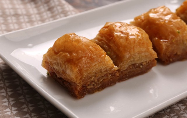 Na maslacem premazane kore pospite orahe i slažite slojeve. Izrežite na “dijamante”. Prelijte otopljenim maslacem i pecite na 180 °C oko 30 minuta. Zakuhajte šećer, vodu i limunov sok. Dodajte med. Prelijte sirup preko vruće baklave i ostavite da se upije.