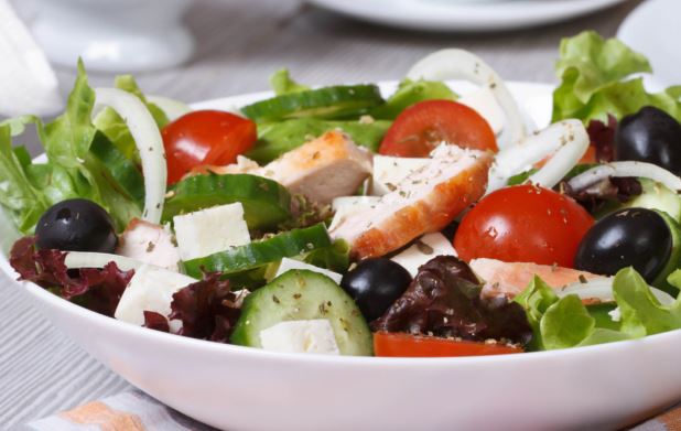 U posoljenoj vodi kuhajte piletinu do vrenja, zatim poklopite i kuhajte još 15 minuta. Ohladite je i narežite na manje komade. Pomiješajte ocat, češnjak u prahu, sol i papar u većoj zdjeli. Dodajte zelenu salatu, piletinu, rajčice, krastavac, luk, masline i fetu pa sve lagano izmiješajte.