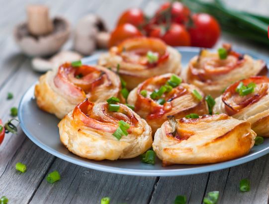 Razvaljajte lisnato tijesto na pobrašnjenoj podlozi pa ga izbockajte vilicom. Premažite ga umakom od rajčice 1,5 cm od rubova. Pospite sirom i šunkom te začinima. Zarolajte tijesto pa ga režite na komade debljine 2 cm. Posložite rolice na lim obložen papirom za pečenje i pecite u pećnici zagrijanoj na 200 °C oko 20 minuta.