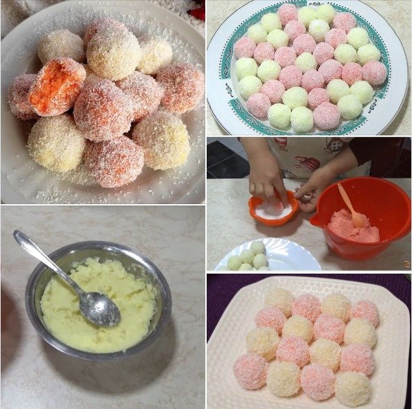 Skloniti sa šporeta i odmah dodati čokoladu i margarin, mešajući dok se ne istopi. Zatim dodajte kokos i keks i podijelite na pola. Jedan dio ostavite kakav jeste, u drugi dodajte boju po želji i dobro promiješajte. Na vrh stavite vrećicu ili foliju i ostavite da se ohladi, a zatim dlanovima oblikujte kuglice i uvaljajte u kokos.