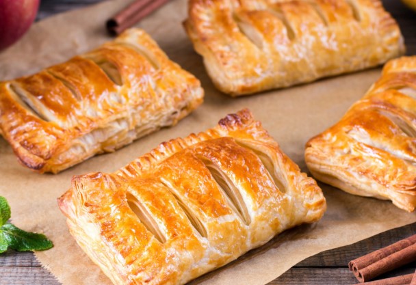 Ogulite i narežite jabuke na tanke ploške. Pomiješajte ih sa smeđim šećerom i cimetom. Razvaljajte lisnato tijesto i narežite ga na kvadrate (oko 10 x 10 cm). Na svaki kvadrat stavite malo smjese od jabuka i preklopite tijesto u oblik trokuta ili pravokutnika.