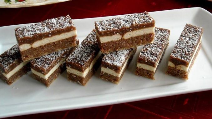 Masu dobro izmešati i naneti preko keksa. Ostaviti da se ohladi i staviti glazuru od čokolade. Istopiti čokoladu sa uljem na tihoj vatri i preliti kolač i preko čokolade dok se još nije stegla posuti kokos.