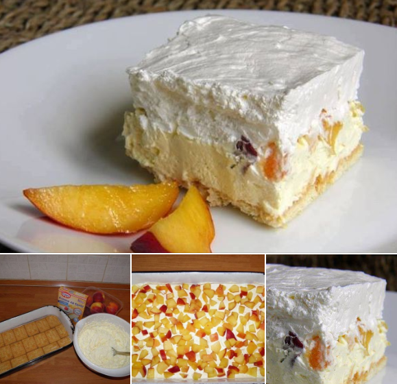 Breskve sitno nasjeckati, pripremiti dodatno slatko vrhnje. Preko keksa nanijeti kremu, po njoj rasporediti breskve, preko breskvi šlag pa sve skupa dobro rashladiti. Dobar tek!