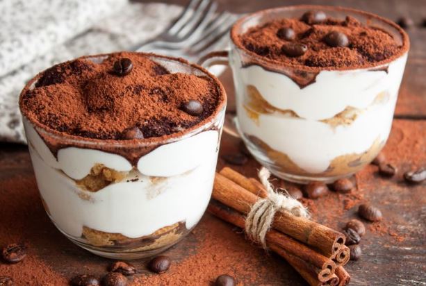 Pripremite čaše ili zdjelice u kojima ćete slagati i servirati tiramisu. Uzmite dvije piškote, razlomite ih, namočite i stavite u čašu, a zatim na piškote stavite žlicu kreme. Ponovite sloj piškota i završite sa slojem kreme. Po vrhu posipajte s kakaom.