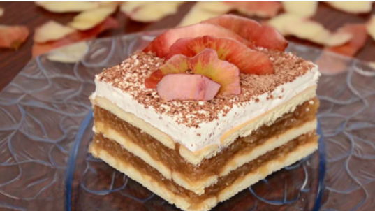 Počnite slagati kolač u tepsiji dimenzija 21X36 cm. Bez prethodnog umakanja složite red petit keksa. Prelijte pola smjese od jabuka. Ponovo složite red keksa. Prelijte ostatak smjese od jabuka.