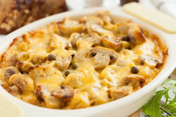 Sastojci: 300 g pilećeg filea 600 g krumpira sol, papar 2 žlice ulja Za umak: 1 gotov umak od gljiva (vrećica od 45 g) 100 ml vrhnja za kuhanje 1-2 žlice naribanog sira ribanca 1 žlica narezanog vlasca Priprema: Pileći file narežite na kockice, posolite, popaprite i ostavite da odstoji oko 15 minuta. Na zagrijanom…