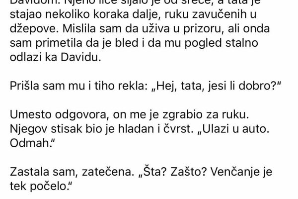 Zalazak sunca obasjavao je crkveno dvorište dok su gosti nazdravljali mladencima, a ja sam sedela za stolom i posmatrala sestru kako pleše sa Davidom. Njeno lice sijalo je od sreće, a tata je stajao nekoliko koraka dalje, ruku zavučenih u džepove. Mislila sam da uživa u prizoru, ali onda sam primetila da je bled i…