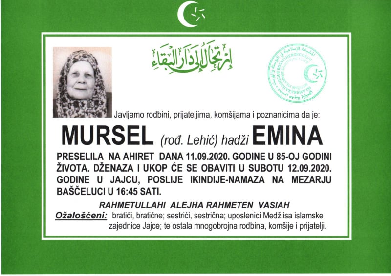 U 85. godini života preminula je Emina Mursel, žena poznata po svom dobročinstvu i koja se smatra najvećom ženom-vakifom u Jajcu poslije sultanije Esme. Hanuma Emina prije rata sa svojim mužem Redžifom uvakufila je 70.000 KM za renoviranje džamije Esme sultanije, a njihovo dobročinstvo osjetio je MDD “Merhamet” koji im je u znak zahvalnosti dodijelio…