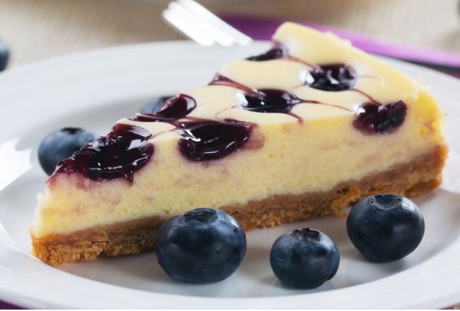 Kriške cheesecakea poslužite s preostalim svježim borovnicama.
