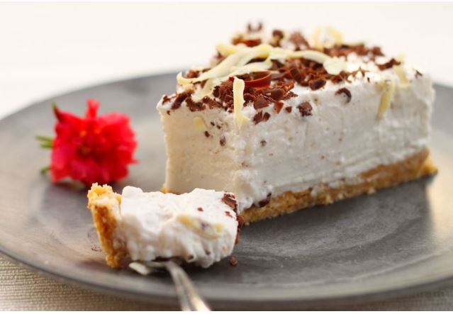 Kremu potom ulijte u kalup obložen keksima. Poravnajte kremu špatulom i stavite kolač u hladnjak preko noći. Nakon hlađenja po želji ga možete ukrasiti naribanom bijelom i tamnom čokoladom, tučenim slatkim vrhnjem ili mljevenim kokosom, a možete poslužiti i rustikalnu varijantu bez ukrasa.