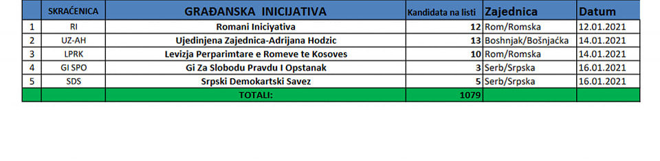Pet građanskih inicijativa su: Romska inicijativa, Ujedinjena zajednica – Adrijana Hodžić, Progresivni pokret kosovskih Roma, GI za slobodu pravdu i opstanak i Srpski demokratski savez.