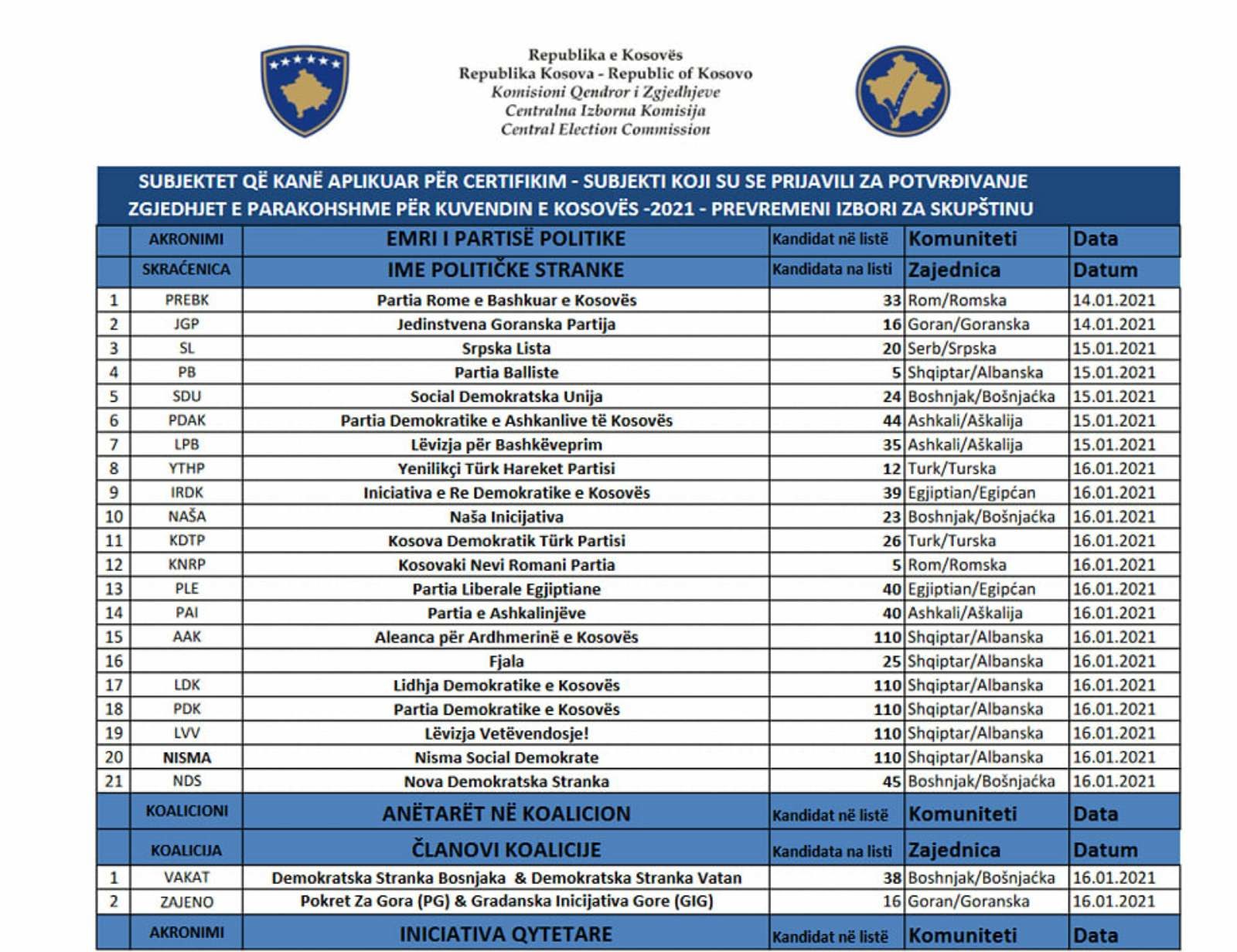 Centralna izborna komisija je objavila spisak 28 političkih subjekata koji su se prijavili za vanredne parlamentarne izbore 14.februara, 2021. godine na kojima je 1.079 kandidata.