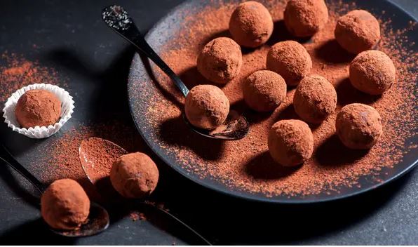 150 g tamne čokolade s narančom, 120 g vrhnja za šlag, 30 g maslaca, 30 g šećera u prahu, kakao u prahu