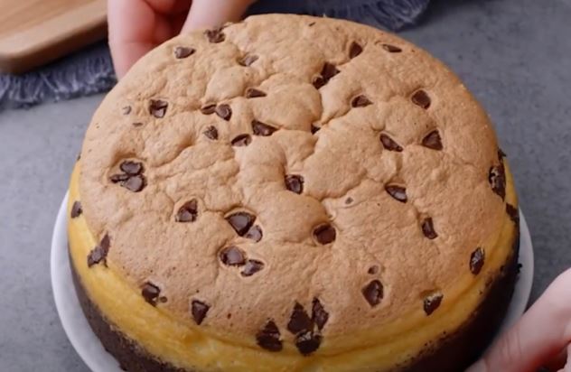 Podijelite bijelu i tamnu smjesu (od bjelanjaka i žumanjaka) na dva dijela. U kalup za pečenje prvo ulijte tamnu smjesu, zatim bijelu, a po vrhu pospite čokoladne kapljice. Pecite u pećnici s vodenom kupkom na 170 °C sat vremena.